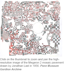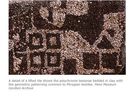 Conserving Gordion’s Mosaic Pavements In 1956-7 the world’s oldest extant mosaic pavement was discovered at Gordion. Measuring approximately 32’ x 35’ and covering the entire floor of a large Megaron, the 9th c BCE pavement of small red, blue, white and black pebbles is an exquisite complex geometric patterning of overlapping designs possibly depicting woven textiles for which the city was so famous. Ongoing excavations of the Citadel in the 1960s resulted in the removal of the mosaic pavement to the local Gordion museum. Unlike later classical and Byzantine mosaics, the Gordion mosaics were laid in clay—not lime mortars—and their transfer proved difficult for then current practices. Set in cement, their current display is disfiguring and the materials and environment are causing deterioration of this world class example of ancient mosaic art. |
