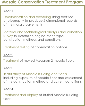 The mosaic conservation program is a multi-phase project to be executed over three years with generous support from the Kaplan Fund and 1984 Foundation. The program seeks to not only address the immediate remedial conservation needs of the Megaron 2 mosaic but also to study its technology to expand the knowledge of mosaic development in the ancient world and to use that information to produce a replica for display on the site of its removal. Once the mosaic is conserved and the site replica reproduced, a known undisturbed pavement within the Mosaic Building will be partially exposed to study its condition and possible exposure (providing its protection can be guaranteed). A traveling exhibit, publication and video are also planned to document the entire process as a cultural and social activity. |